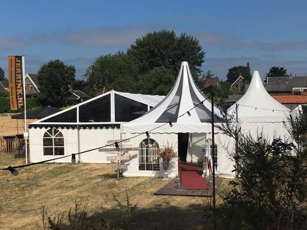 De pagode tent heeft een luxe uitstraling en is voor de helft voorzien van ramen. Deze tenten zijn vierkant, maar kunnen heel goed gekoppeld worden in bijvoorbeeld 4m x 8m, 5m x 10m of 6m x 12m.